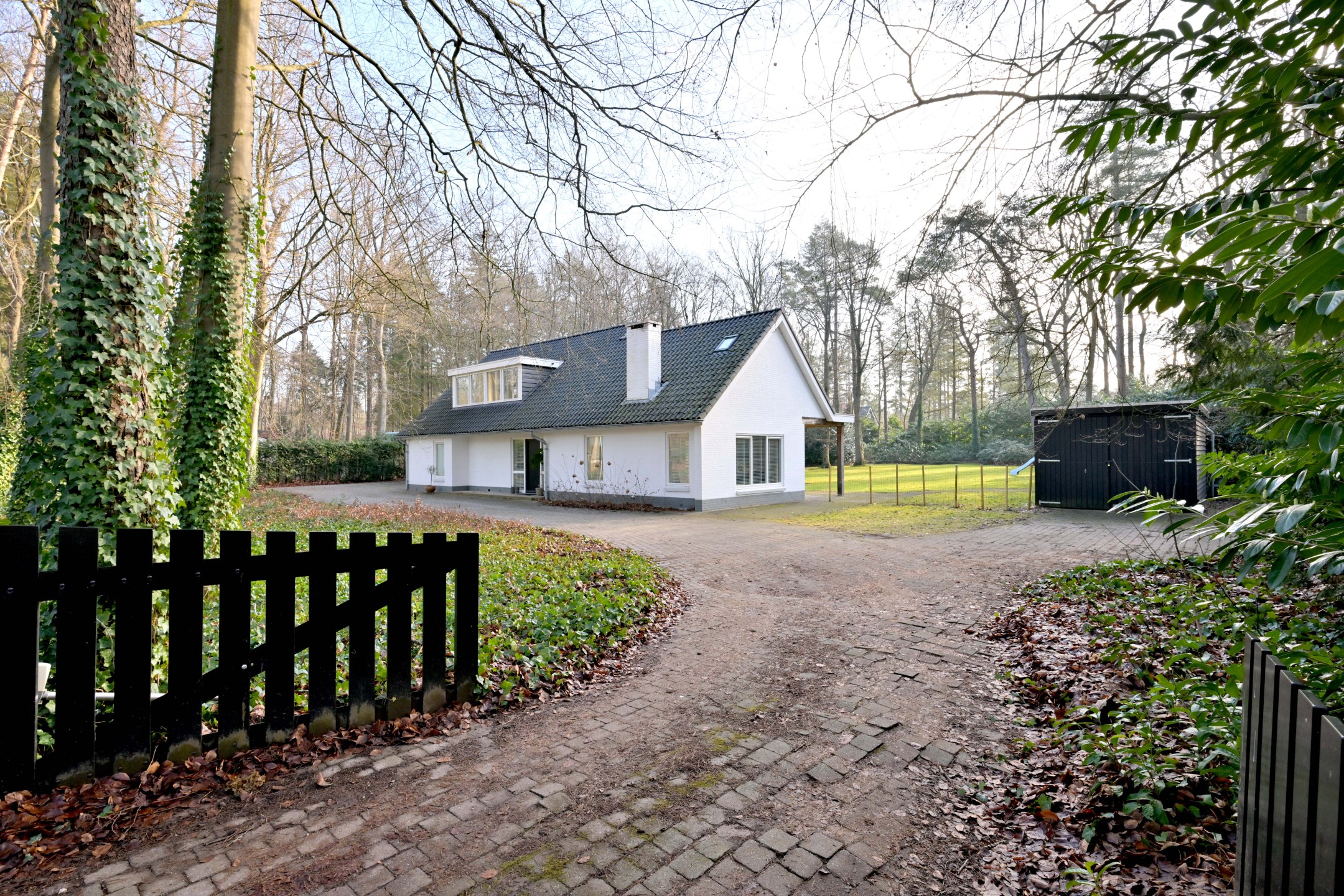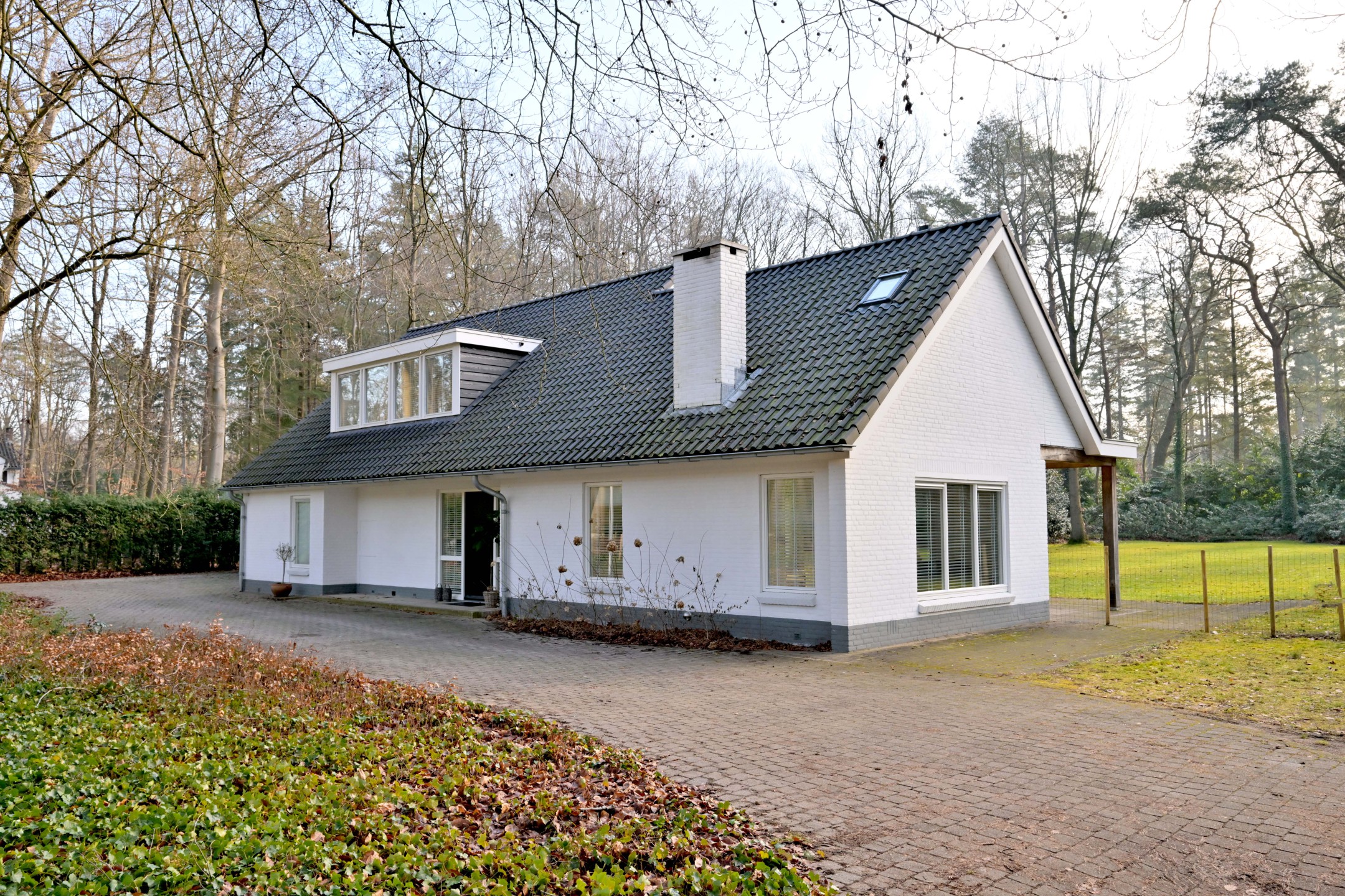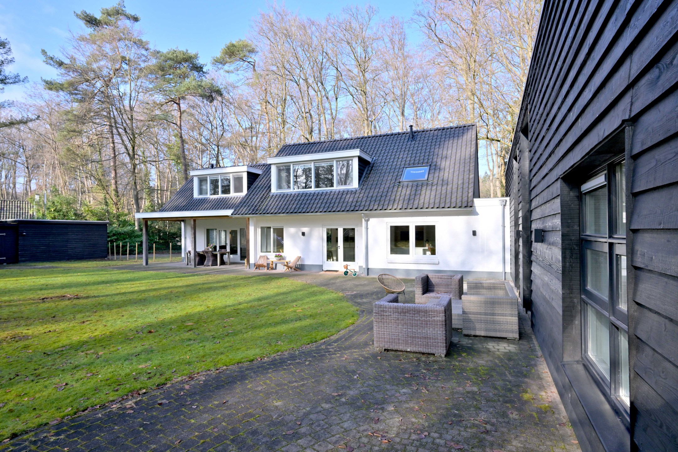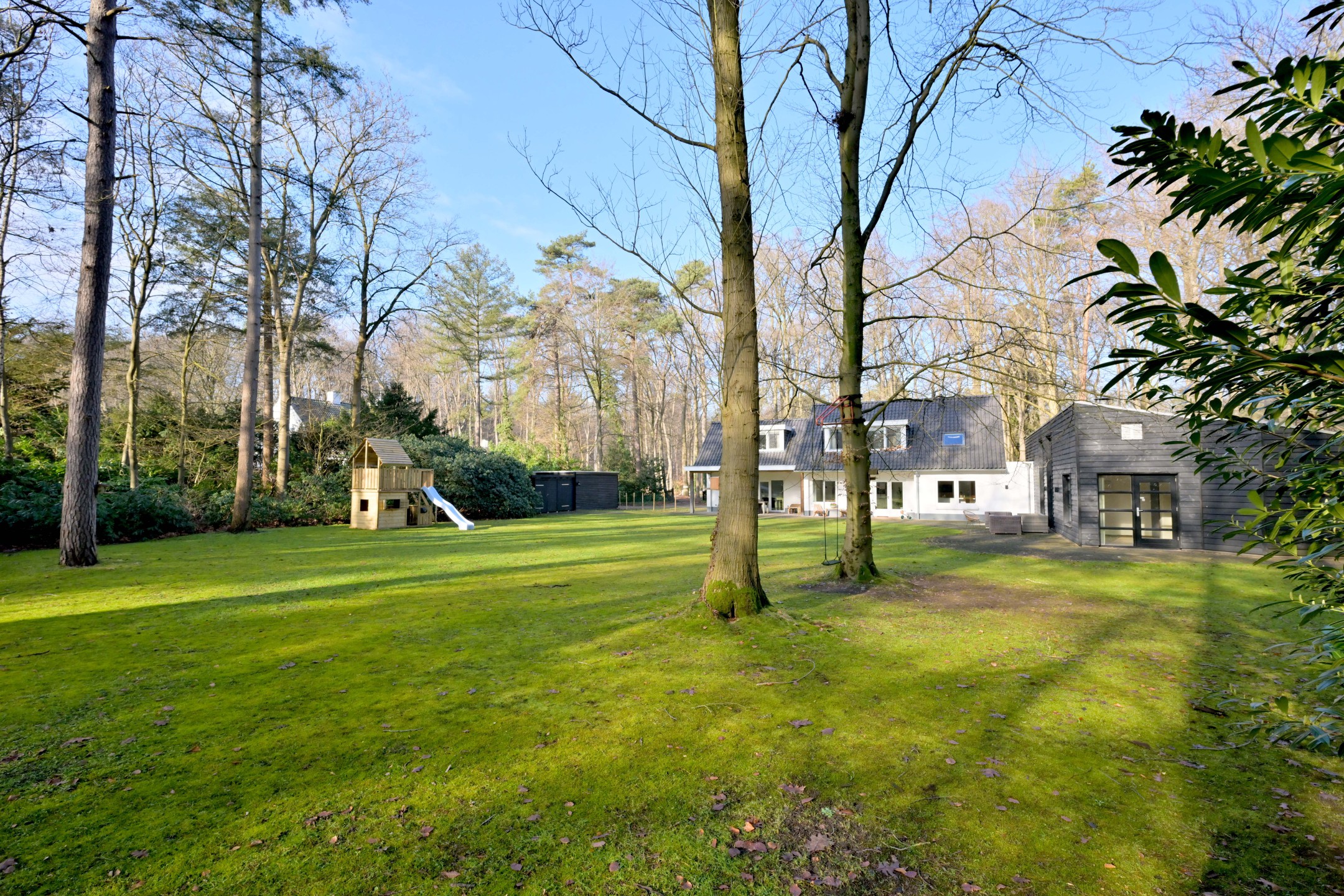 Halfronde oprit, met twee toegangshekken en veel parkeerruimte, leidt naar het huis en de garage. Het is een diepe houten garage met berging aan de achterzijde (ca. 31 m²). Er ligt een fraaie tuin rondom met groot grasveld, rododendrons en diverse loof- en naaldbomen. Het ruime perceel en ook de ruime aangrenzende percelen geven optimale vrijheid en privacy. De grote terrassen en het overdekte terras (veranda) zorgen ervoor dat u maximaal van het buitenleven kunt genieten. De tuin is voorzien van een beregeningsinstallatie met grondwaterpomp en een robotmaaier maait het gras.