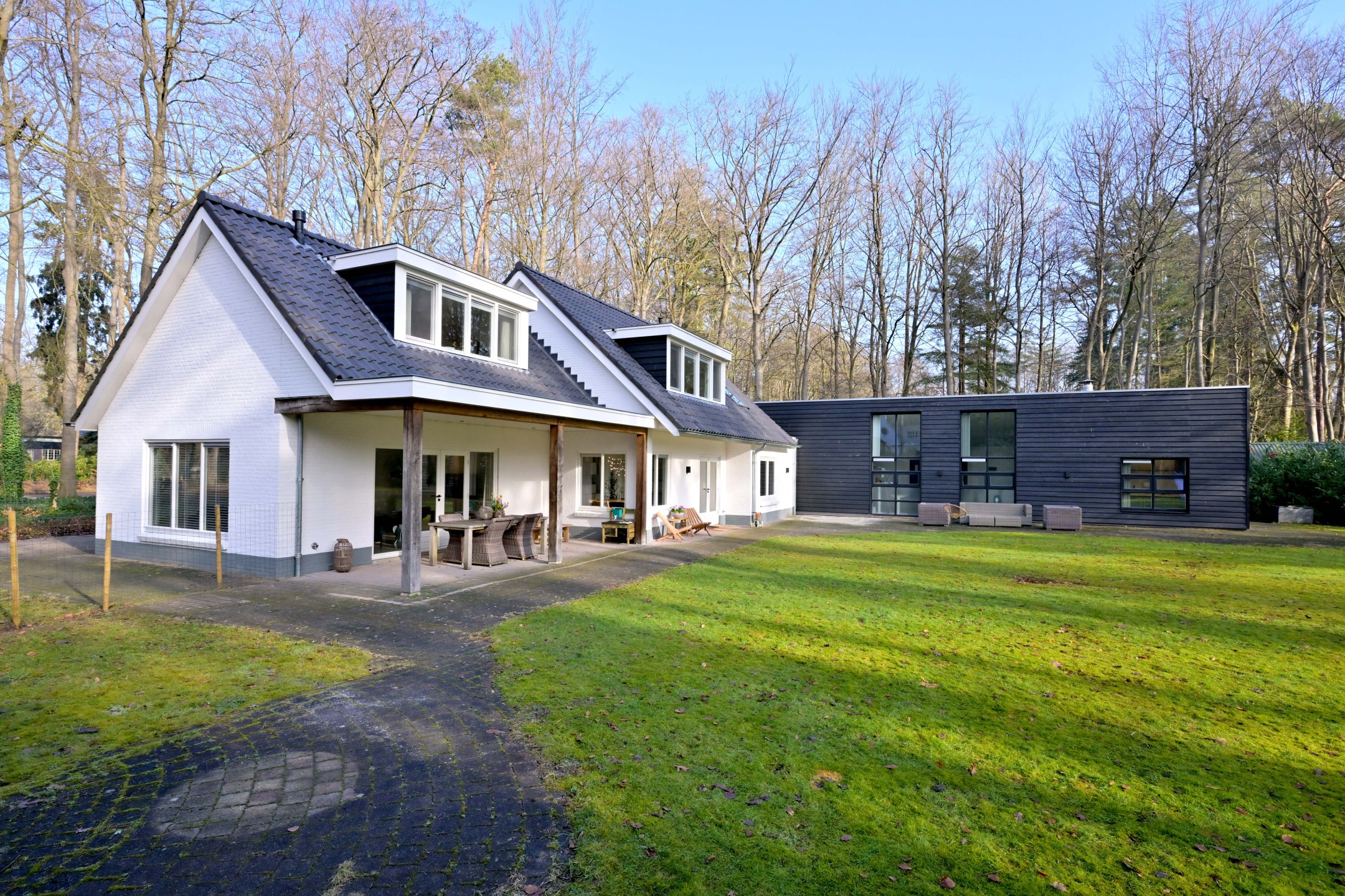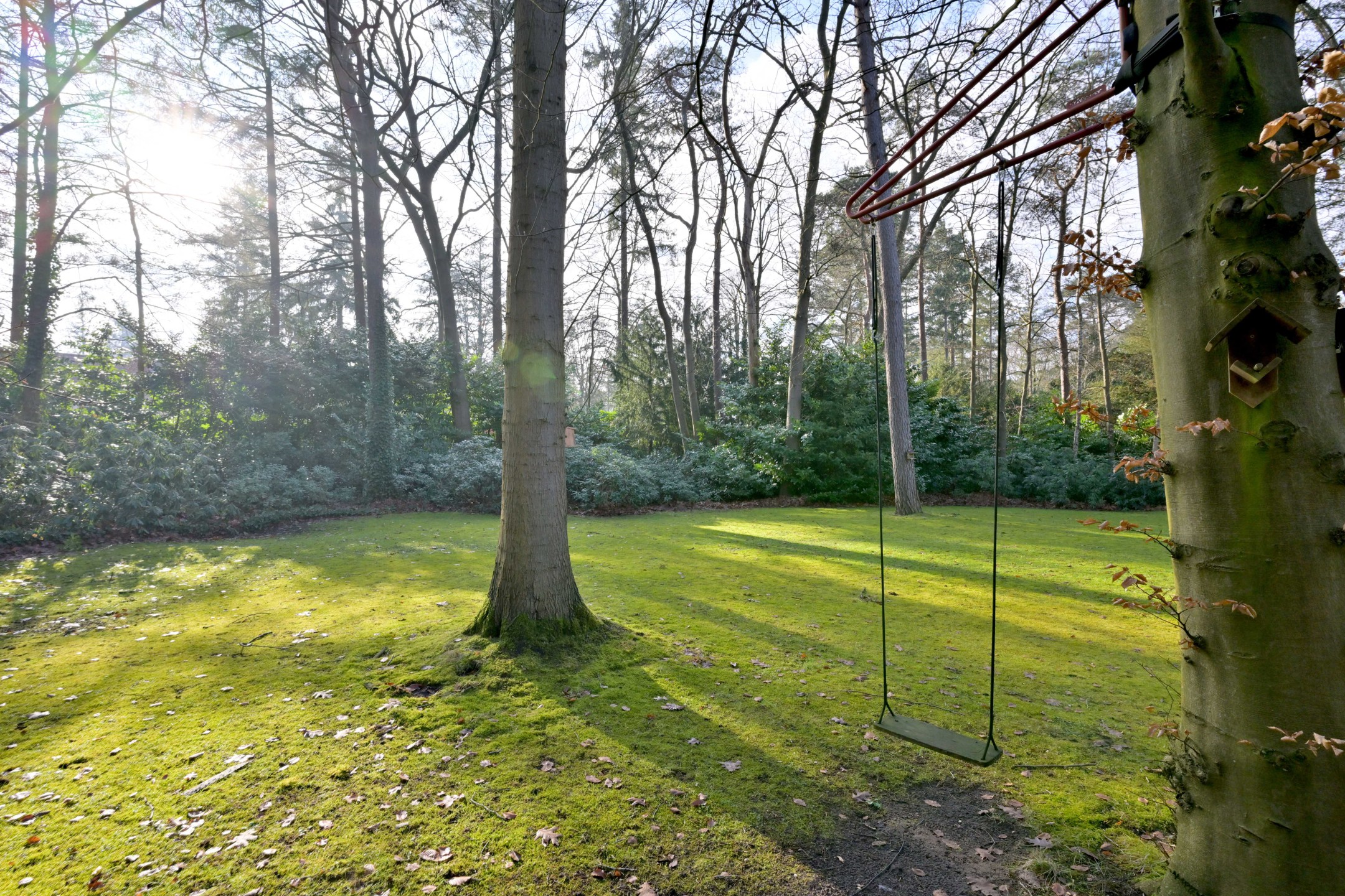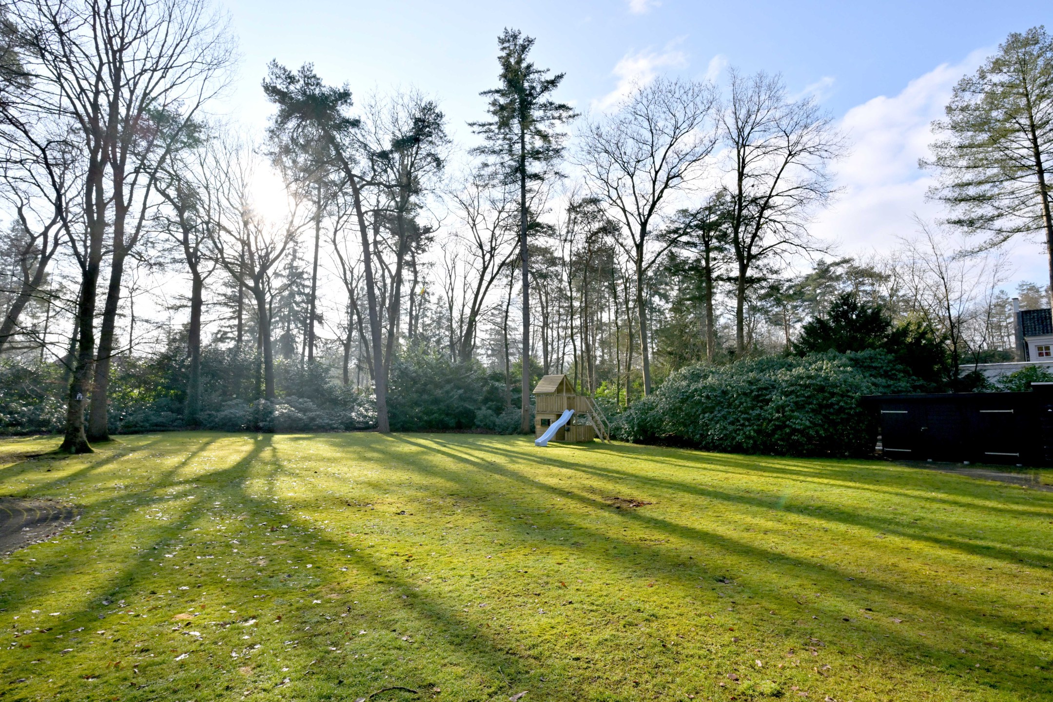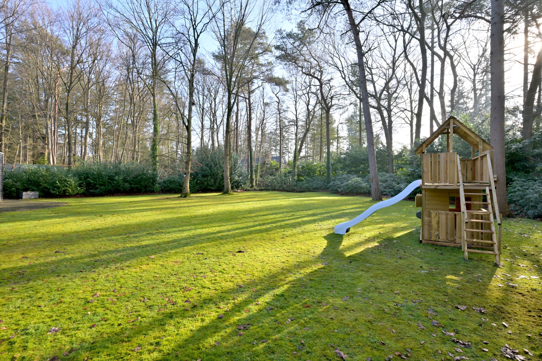 Halfronde oprit, met twee toegangshekken en veel parkeerruimte, leidt naar het huis en de garage. Het is een diepe houten garage met berging aan de achterzijde (ca. 31 m²). Er ligt een fraaie tuin rondom met groot grasveld, rododendrons en diverse loof- en naaldbomen. Het ruime perceel en ook de ruime aangrenzende percelen geven optimale vrijheid en privacy. De grote terrassen en het overdekte terras (veranda) zorgen ervoor dat u maximaal van het buitenleven kunt genieten. De tuin is voorzien van een beregeningsinstallatie met grondwaterpomp en een robotmaaier maait het gras.