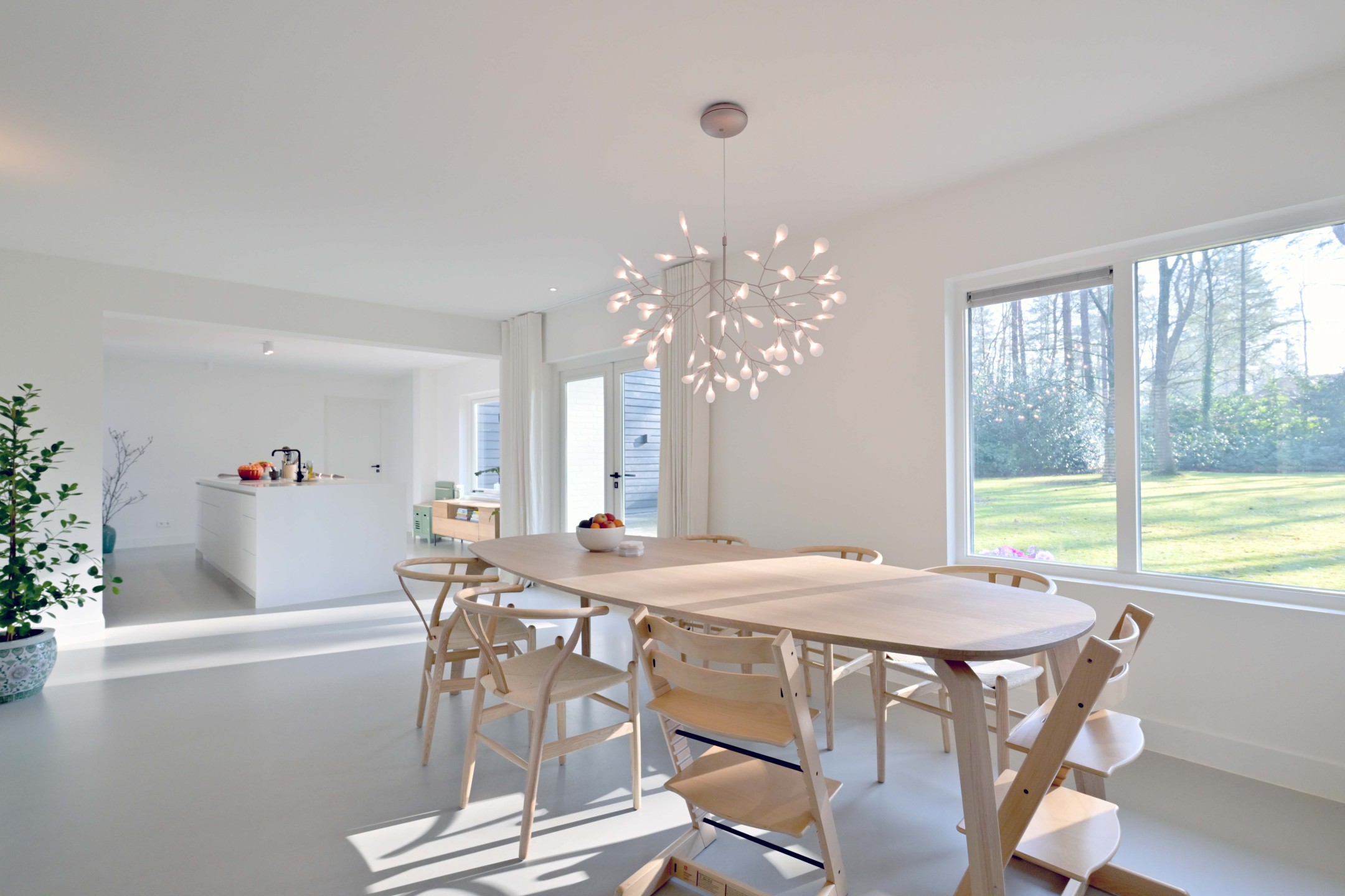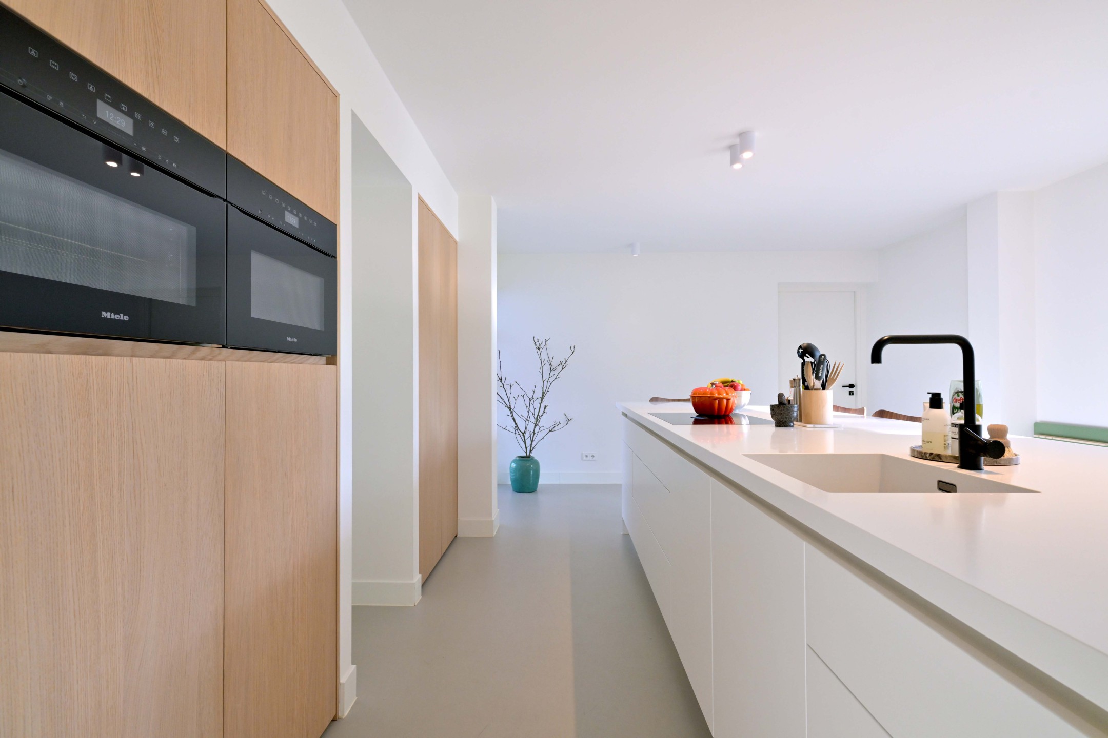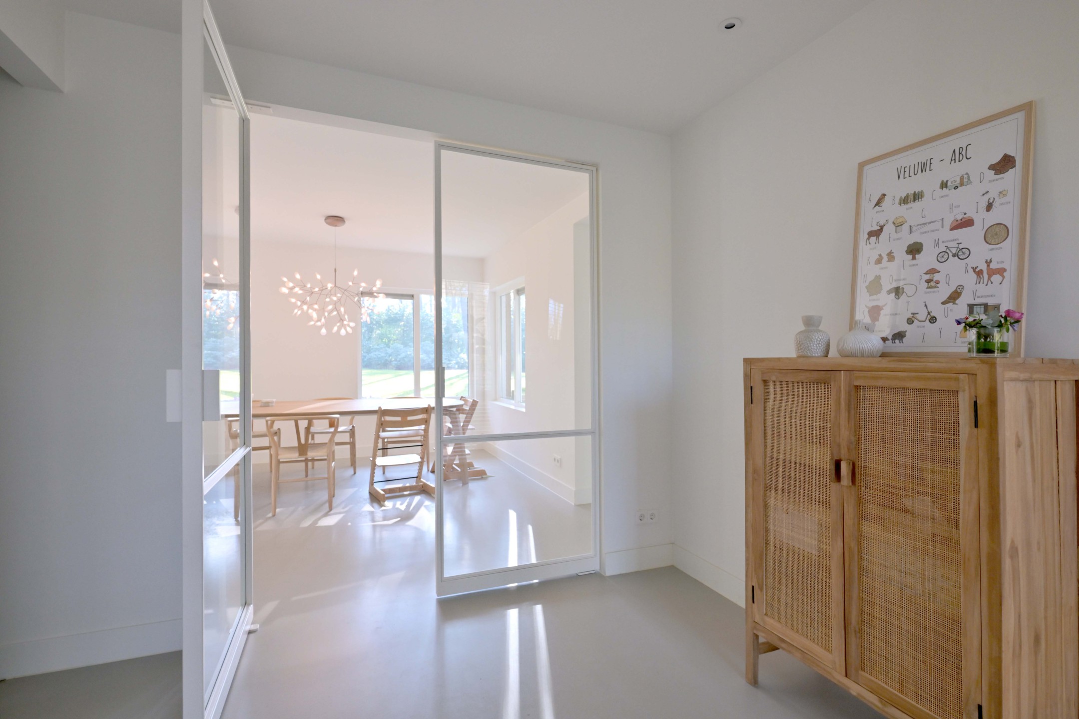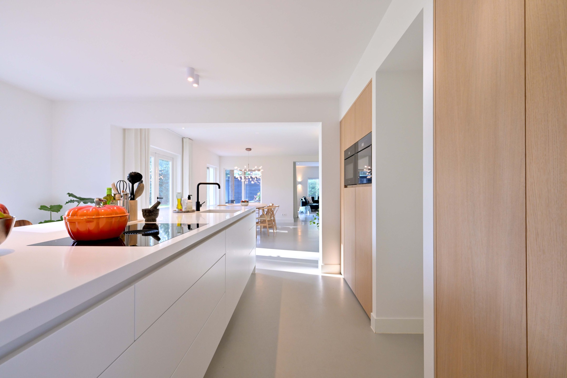 Overdekte entree, hal met wc, garderobe, kelderkast en trapopgang. Via stalen taats-deuren komt u in de grote living. Aan de ene kant de zitkamer met inbouw haard (Boudrie 2025) en openslaande tuindeuren naar overdekt terras. En centraal de eetkamer / woonkeuken met openslaande tuindeuren. De handgemaakte keuken heeft een bijzonder fraai werkeiland met Hi-Macs bladen (met geïntegreerde spoelbak) en Bora inductie kookplaat, veel kastruimte, een eetbar gedeelte en luxe Miele inbouwapparatuur. Aansluitend de bijkeuken met wasmachine aansluitingen, bergruimte en opstelling van de warmtepomp.