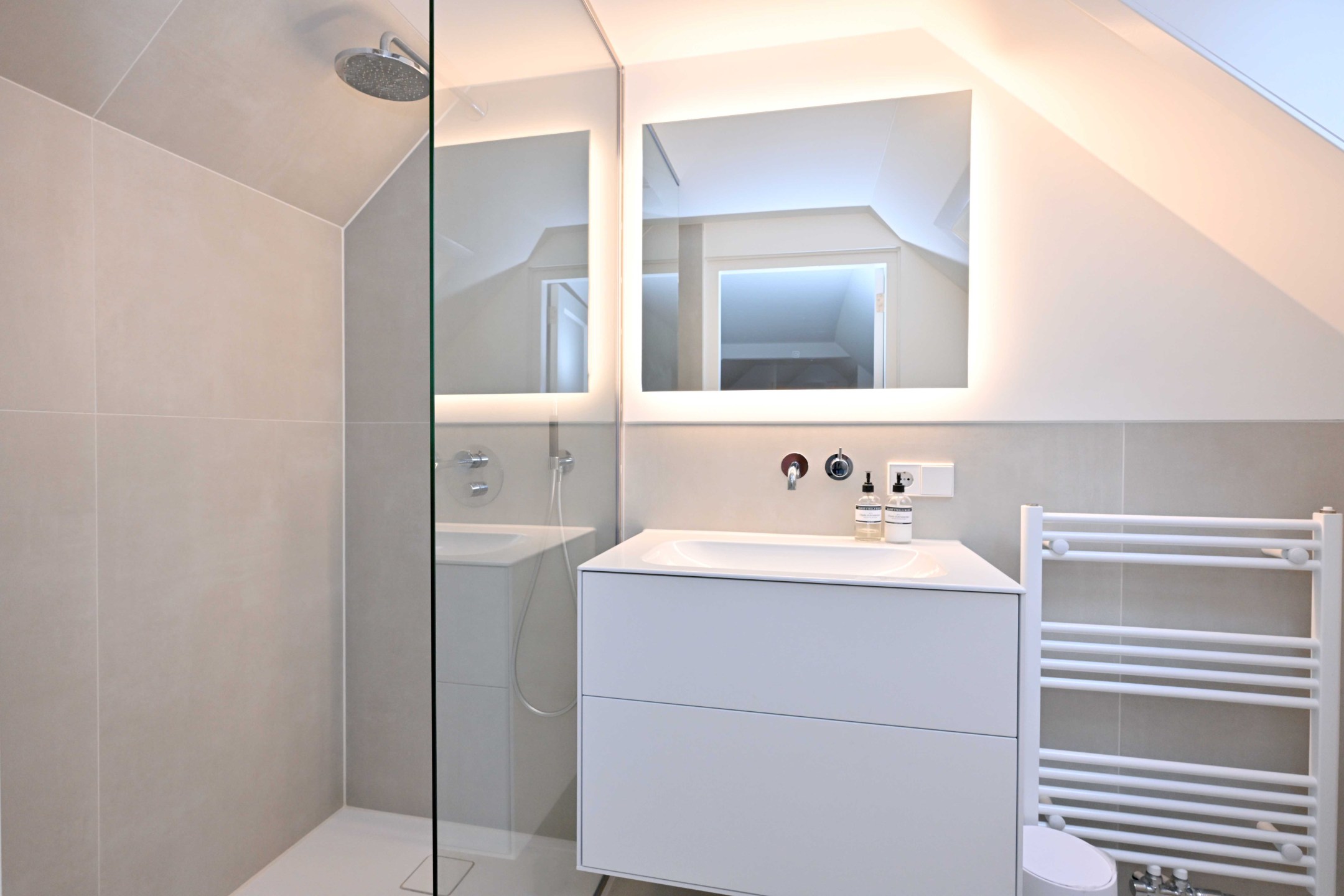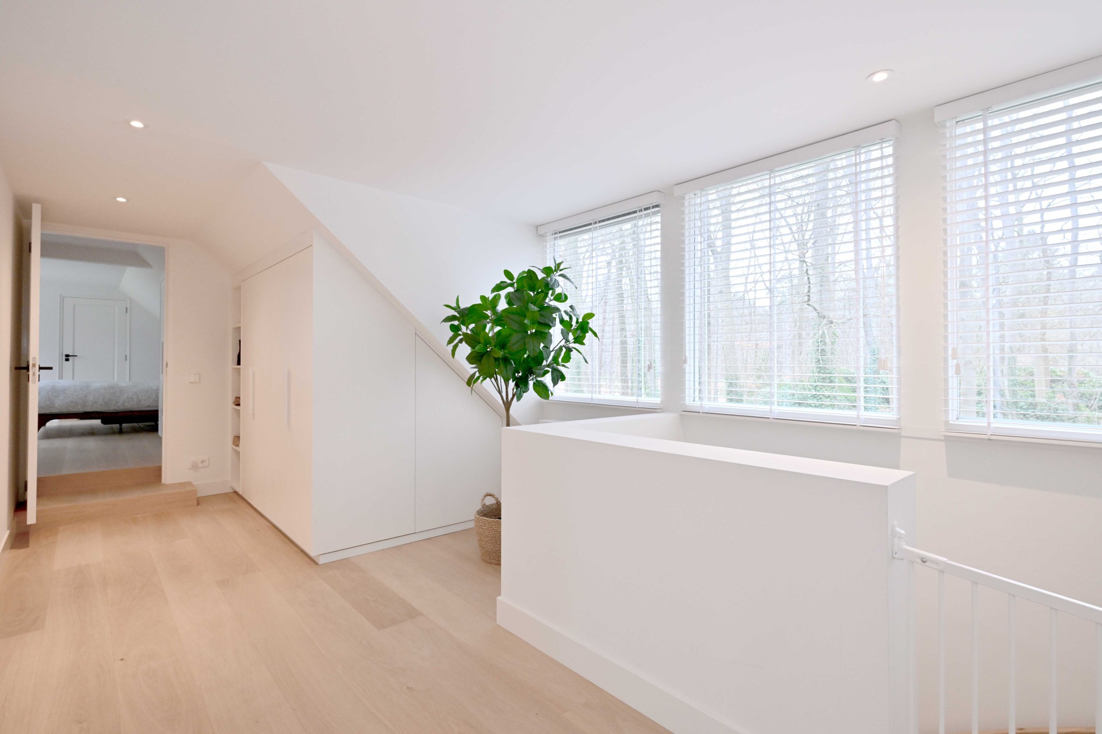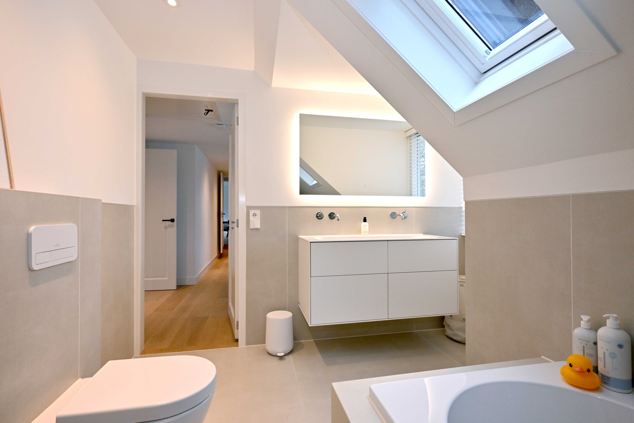 Ruime en lichte overloop met dakkapel. Hoofdslaapkamer met dakkapel en eigen badkamer met inloopdouche, wc en wastafelmeubel. De overloop en de hoofdslaapkamer hebben handgemaakte kleedkasten (Kloppenberg 2025). Slaapkamer met dakkapel, derde slaapkamer en een moderne badkamer met ligbad, inloopdouche, wc en wastafelmeubel.