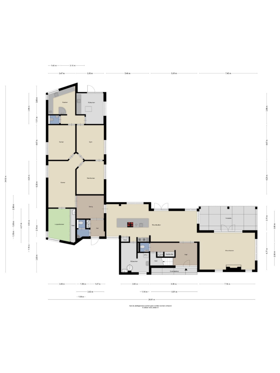 Vanuit de keuken doorgang naar de vleugel. Dit gedeelte heeft een eigen entree, hal met wc en vervolgens meerdere ruimtes / kamers. Er is een logeerkamer aan de voorzijde, 4 kamers in het midden met aan de tuinzijde een werkkamer en sportruimte met hoge plafonds. Aan de achterzijde is een keuken, wc en een bijkeuken met bergvliering en tuindeur.